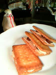 ココナッツサブレにマーガリン塗って、昨日日本酒に漬けたレーズンを挟んだ。