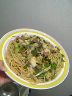 セロリとベーコンのパスタ。なぜかパスタを作ると3人前くらい作ってしまう。一気に完食したがな。
